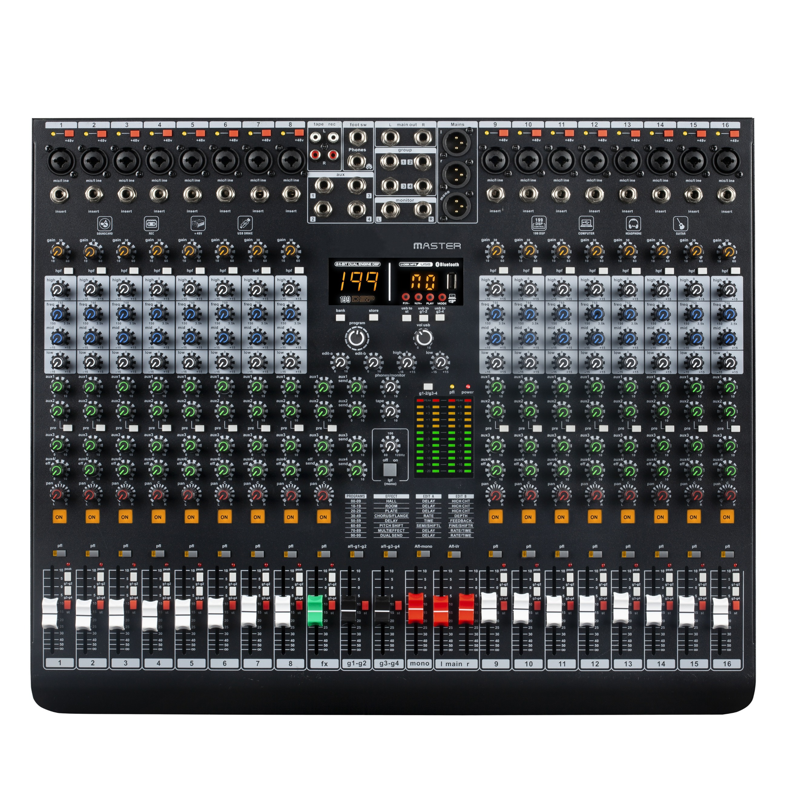4.每路單聲道輸入通道設有4段EQ(立體聲三段),分路通道設有壓限控制,設有峰值指示燈。